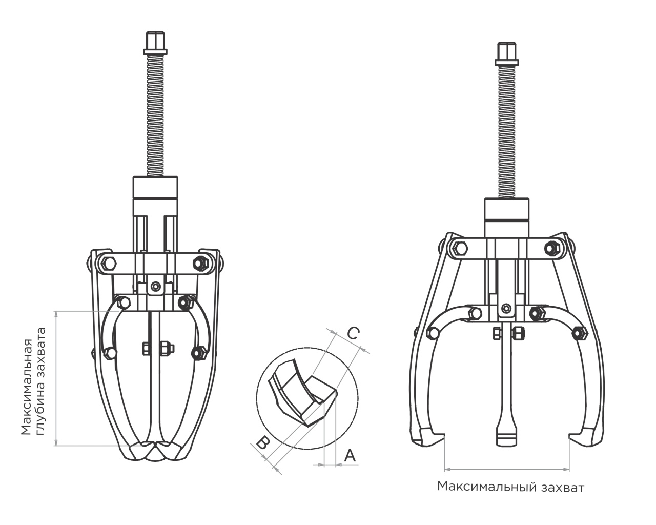 Конструкция съемника позволяет быстро и точно отцентровать захватные лапы, настроив на нужный размер, и не затрачивая время на дополнительные регулировки.