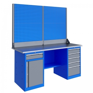 Верстак серии Technic 181.58.2-2 состоит из столешницы шириной 1796 мм, тумбы P5 с четырьмя малыми и одним большим ящиком, тумбы P8 с малым ящиком и отделением с дверью, полки-стенки, двойного экрана с кронштейнами