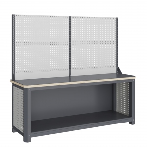 Экран (перфорированная панель) верстака выполнен с квадратной перфорацией 12х12 мм с шагом 38 мм для установки крючков, держателей и других аксессуаров. Экран крепятся к столешнице с помощью специальных кронштейнов. Максимальная масса груза, равномерно распределенного по поверхности экрана, составляет 71 кг.